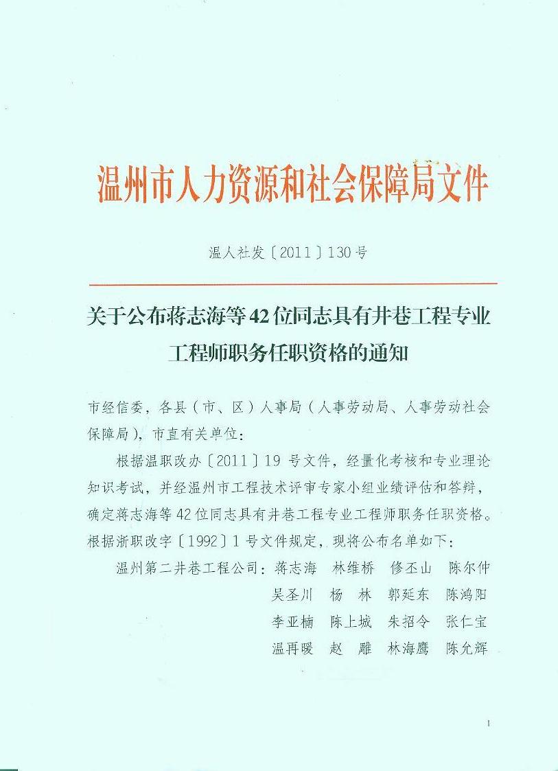 關于公布蔣志海等42位同志具有井巷工程專業工程師職務任職資格的通知